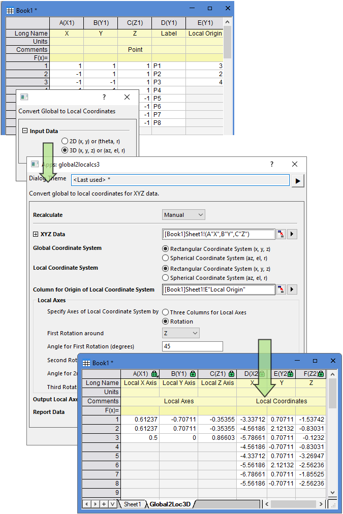 This app provides a sample OPJU file. Right click on the Convert Global to Local Coordinates icon in the Apps Gallery window, and choose Show Samples Folder from the short-cut menu. A folder will open. Drag-and-drop the project file G2LEx.opju from the folder onto Origin. The Notes window in the project shows detailed steps.