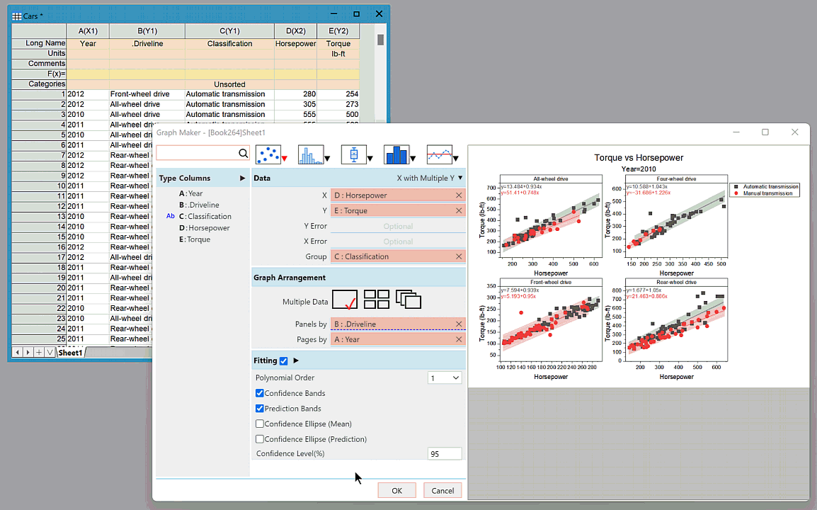 Fitting is available for certain plot types. When enabled, you can easily customize the graph to display confidence or prediction bands, as well as show the fitting results directly on the graph.