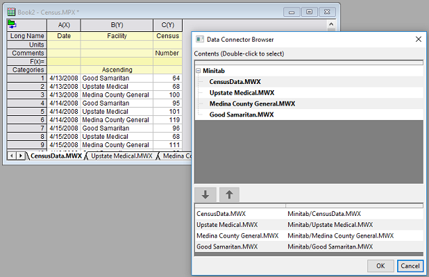 This App connects the Origin project to Minitab projects (*.mpx) and worksheets (*.mwx).