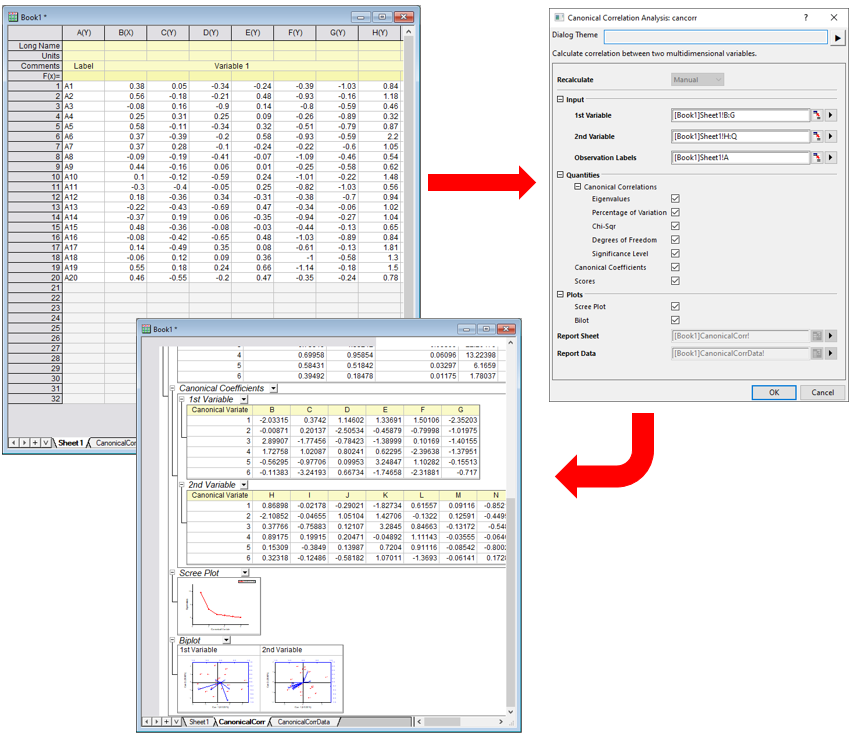 This app provides a sample OPJU file. Right click the App icon in the Apps Gallery window, and choose Show Samples Folder from the short-cut menu. A folder will open. Drag-and-drop the project file CanonicalCorrSample.opju from the folder onto Origin. The Notes window in the project shows detailed steps.